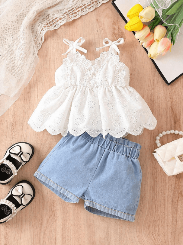 SHEIN Haut caraco à bordure festonnée et nœud aux épaules pour bébé fille et short taille paperbag