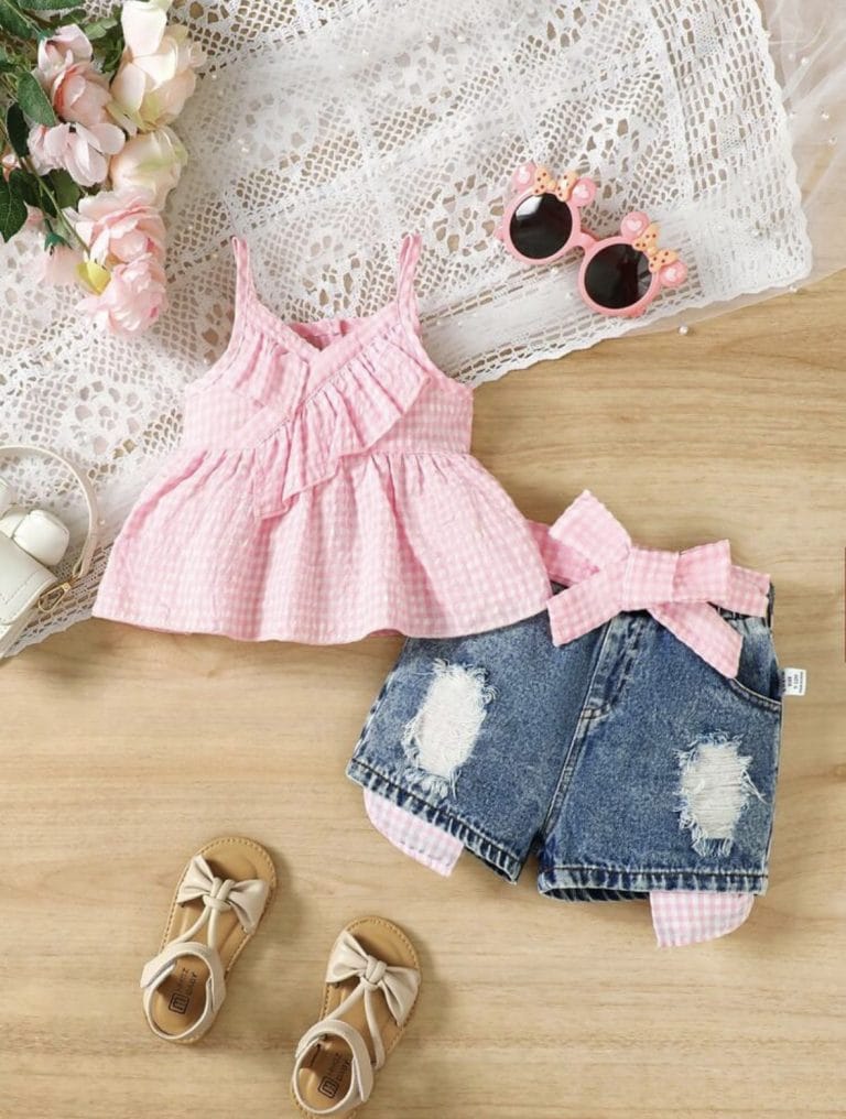 SHEIN 2 pièces Ensemble de bretelles à carreaux et de shorts en jean déchirés pour les filles en bas âge