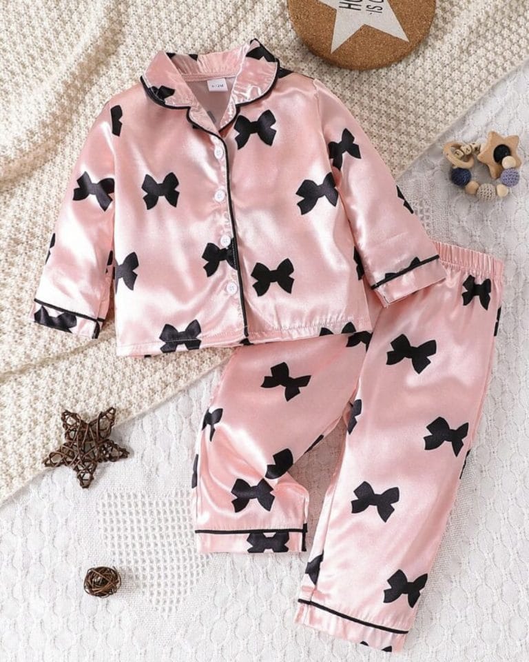 Ensemble de pyjama satiné pour bébé fille avec nœud imprimé et passepoil contrastant