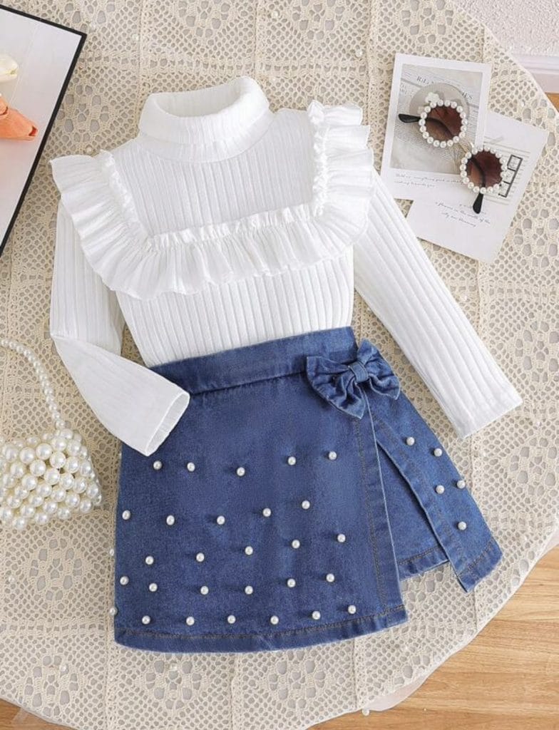 2 pièces ensemble top à manches longues décontracté et jupe en jean pour jeune fille