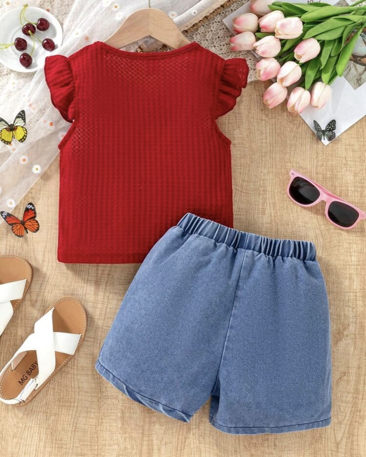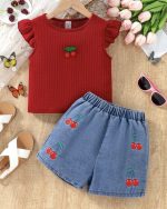 2 pièces Set t-shirt à manches courtes avec imprimé gaufré + shorts en jean brodés de cerises pour jeunes filles navettant