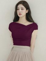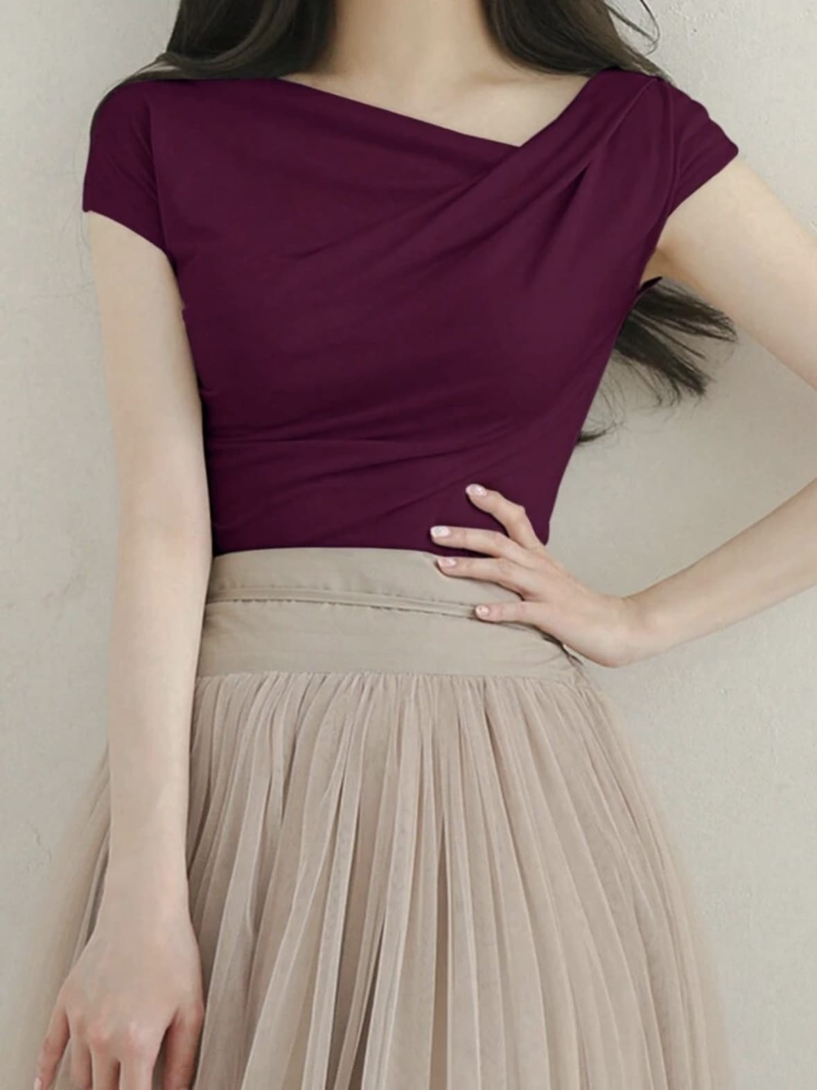 DAZY T-shirt à manches courtes pour femmes d’été, col asymétrique plat, coupe slim avec plis