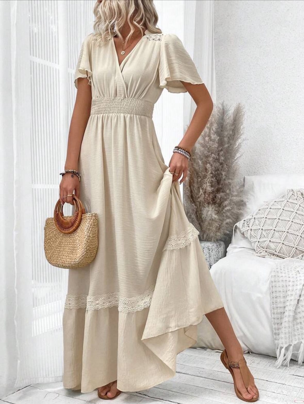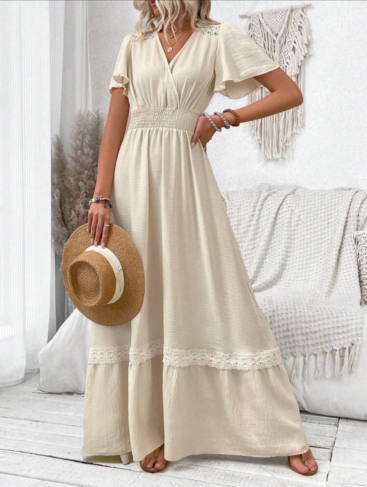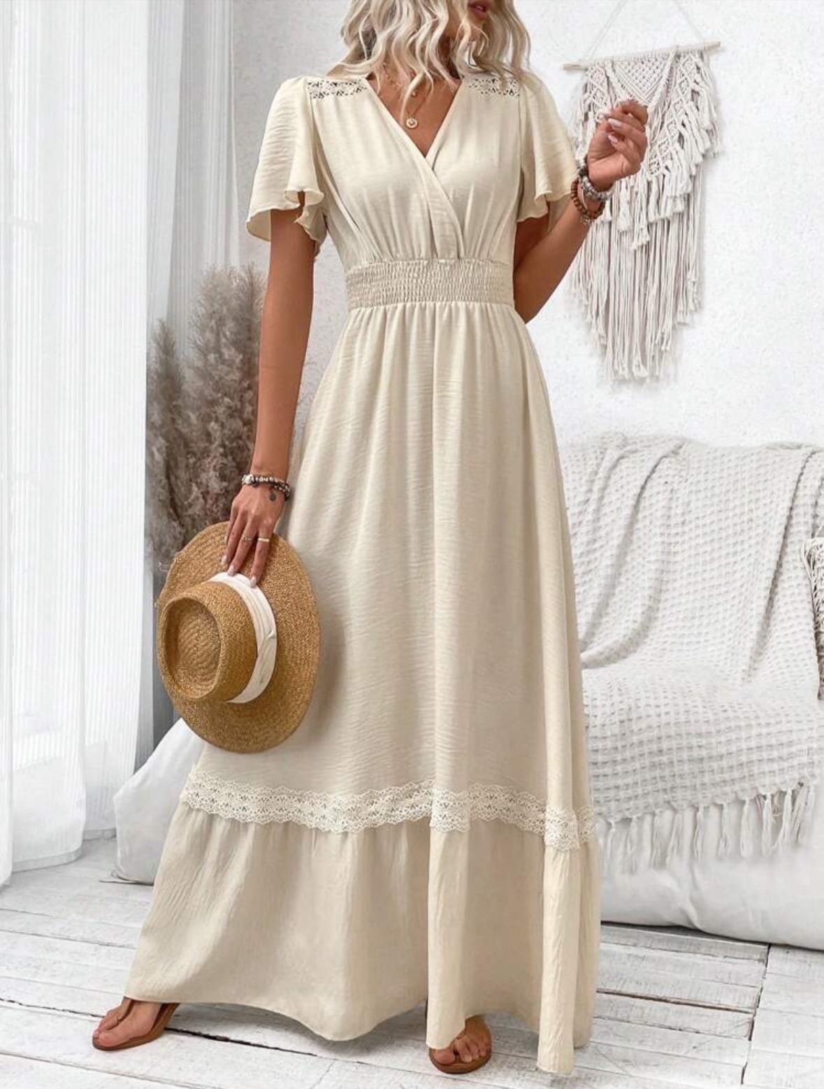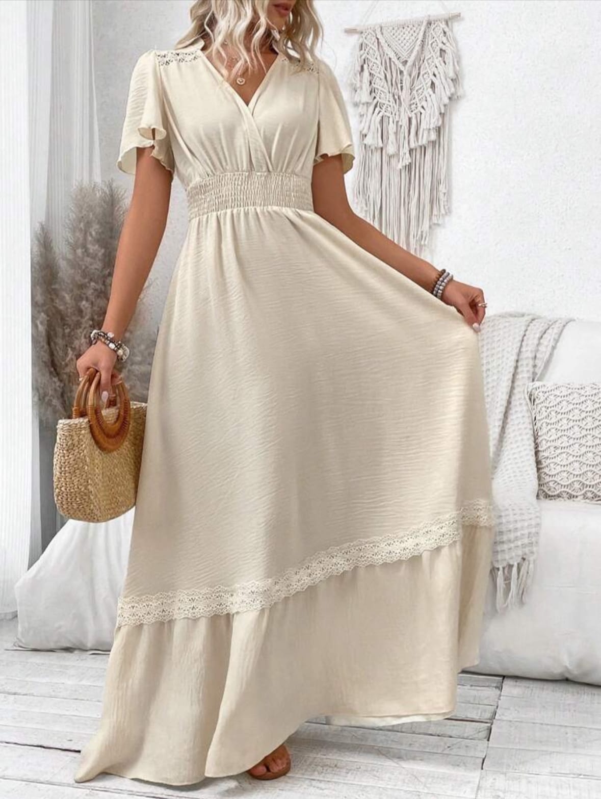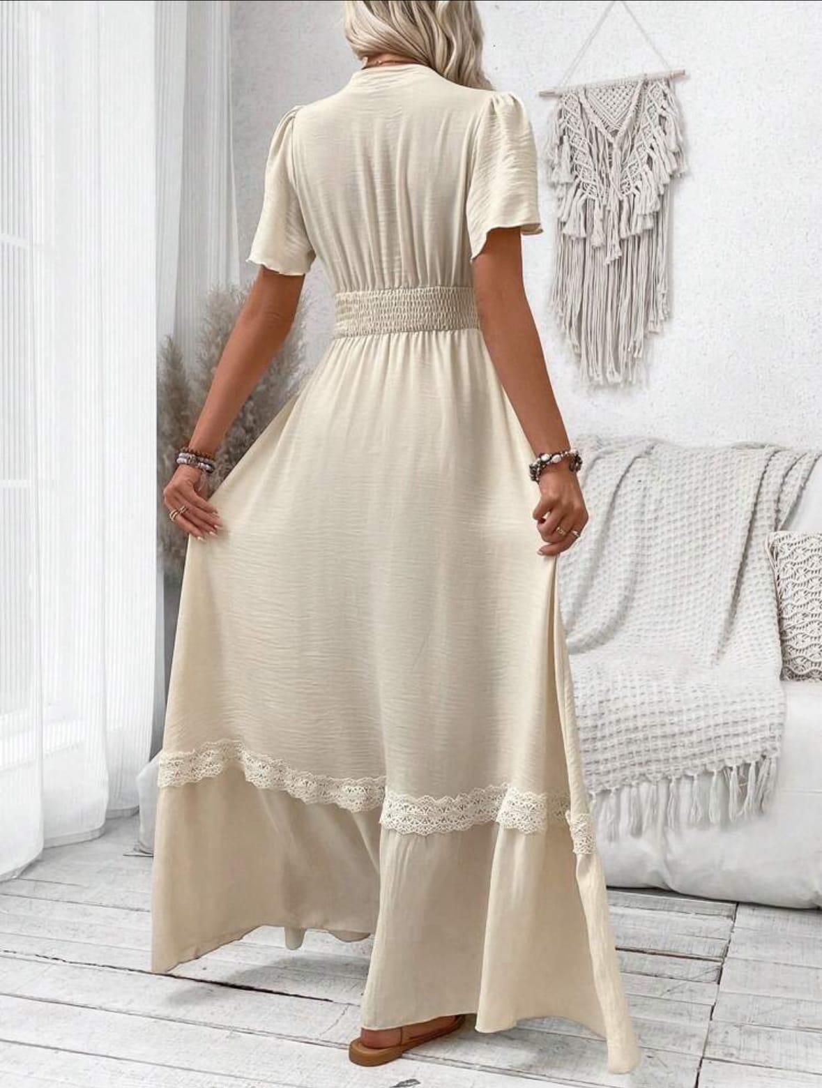 Breezaya Robe longue à empiècement froncé à la taille, manches courtes, col V, pour vacances et plage