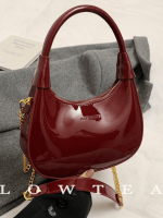 Sac bandoulière en cuir PU verni brillant de couleur unie Low Tea, sac à bandoulière tendance pour femme avec inscription Ancora rouge, poignée supérieure, fermeture éclair en métal, bandoulière en chaîne métallique, pour un usage quotidien et en extérieur.