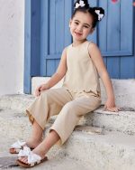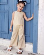 SHEIN 2 pièces/set Top court à col rond de couleur unie tressé et pantalon long ample tressé pour jeune fille
