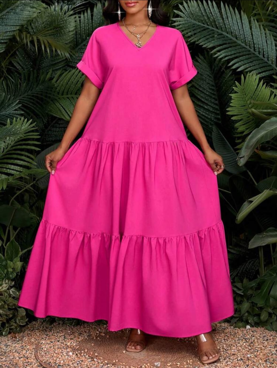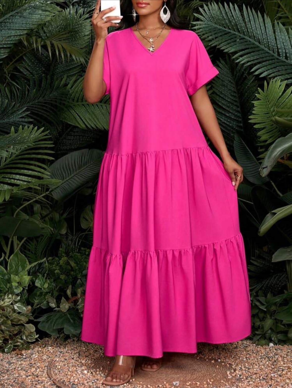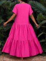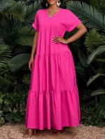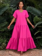 SHEIN Lady Robe longue plissée ample d’été 2025 Femmes Robe de soirée décontractée à col V à manches courtes Robe longue pour fête, vacances, anniversaire et événements / Robe de vacances bohème / Vêtements femmes bohèmes / Tenue de cowgirl bohème pour femmes / Tenue de rodéo pour femmes / Robe de plage de style cowgirl Robe africaine.