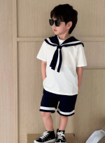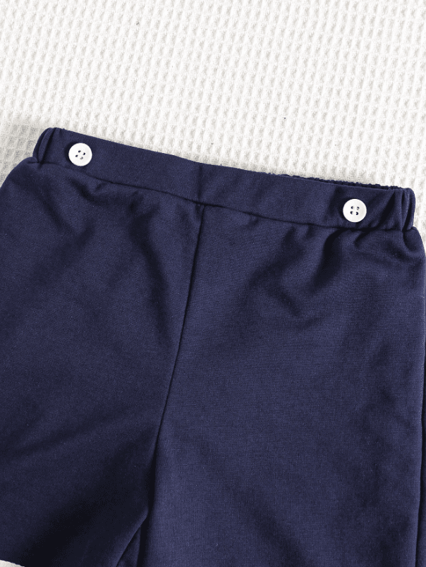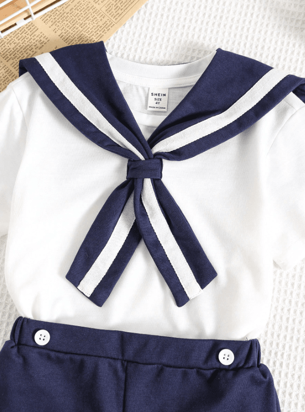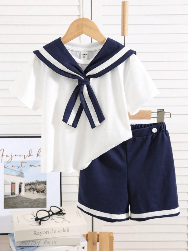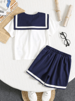 SHEIN Lot de 2 t-shirts et shorts à col rond pour jeunes garçons, style décontracté, style universitaire, style rétro, avec col bleu marine, tenues pour enfants, vêtements pour jeunes garçons, ensemble pour la rentrée scolaire, idéal pour les anniversaires, les soirées, les spectacles, les mariages, les baptêmes, les cérémonies d’ouverture et pour un usage quotidien. Convient pour un usage quotidien, idéal pour l’école, idéal pour les voyages, idéal pour le sport, idéal pour le printemps et l’été.