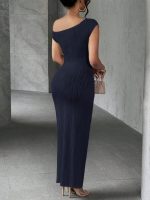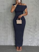 Slaydiva Robe pour femmes en tissu tricoté à texture ondulée, avec jupe longue plissée à l’avant, épaule dénudée en biais pour soirée élégante, sortie ou usage quotidien. Nouvelle collection d’été, blanc